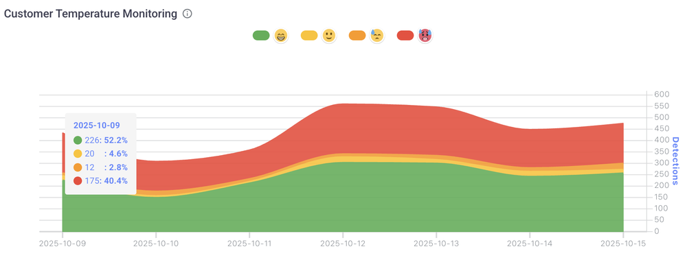 The Customer Temperature Chart tracks the emotional state of customer interactions using an AI-powered analysis system.