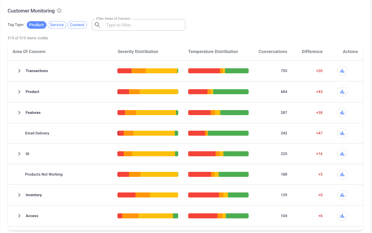 Isara's Customer Monitoring provides a comprehensive view of which products and features are generating the highest volume of support requests. This AI-powered analysis helps organizations identify patterns in customer support needs, enabling more strategic resource allocation and product improvement decisions.