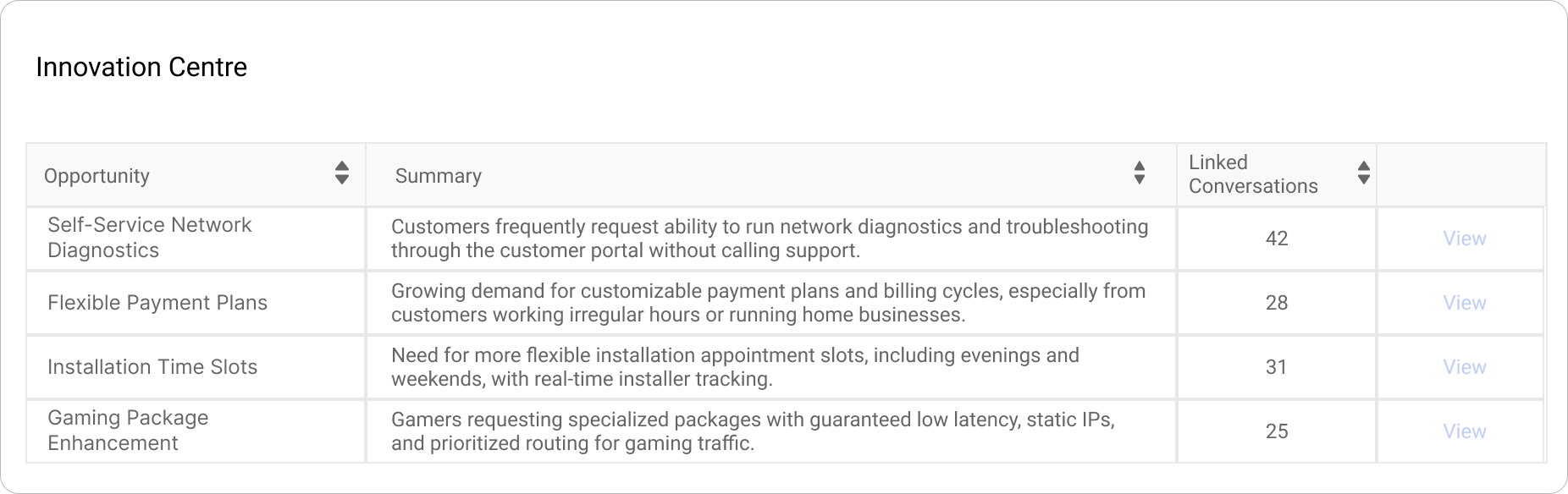 Each idea in the Innovation Centre is tracked with a name, summary, and the number of related conversations, providing a clear indication of customer demand. The platform prioritizes innovations based on relevance and feasibility, streamlining the process from idea discovery to development. This ensures that Isara continuously evolves to enhance customer satisfaction and drive business growth.
