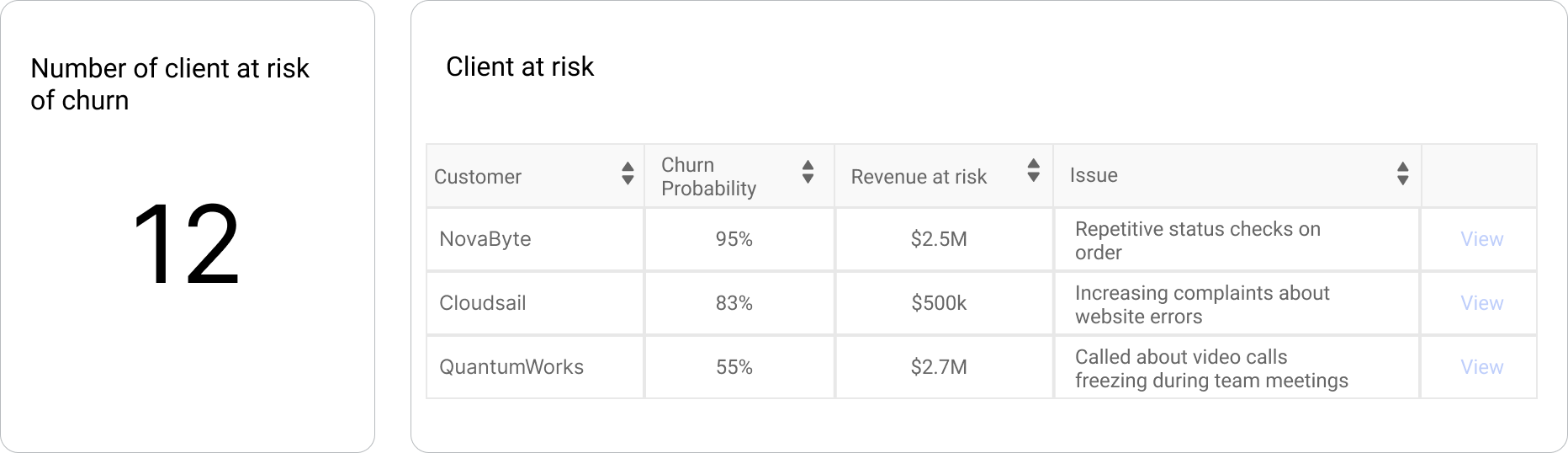 This feature provides key metrics such as the number of customers at risk, churn probability per customer, and the potential revenue impact of churn. Additionally, it offers an automated summary highlighting common issues, sentiment trends, and support gaps. By leveraging these insights, businesses can enhance customer engagement, prevent churn, and protect revenue effectively.