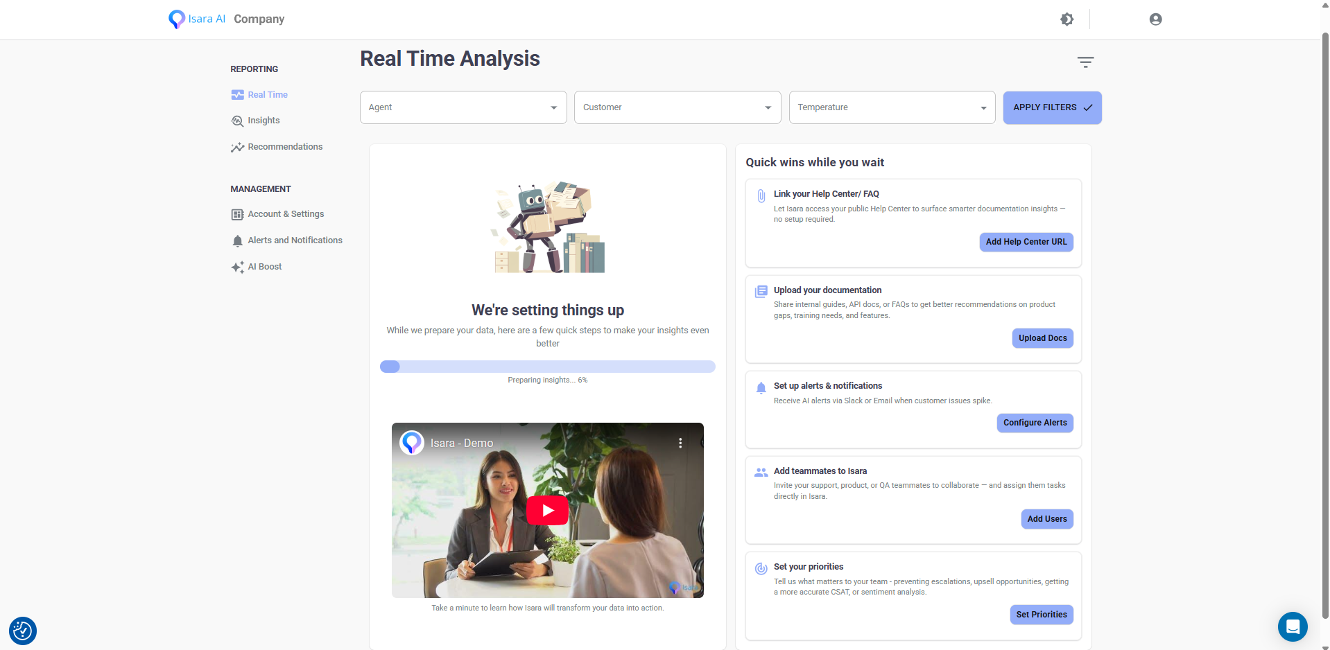The initial onboarding screen will appear while your data is loading. This is a good moment to add key details about your business either directly in the screen or later in Account and Settings. Providing this information helps Isara generate more accurate recommendations and tailor insights to your specific context.