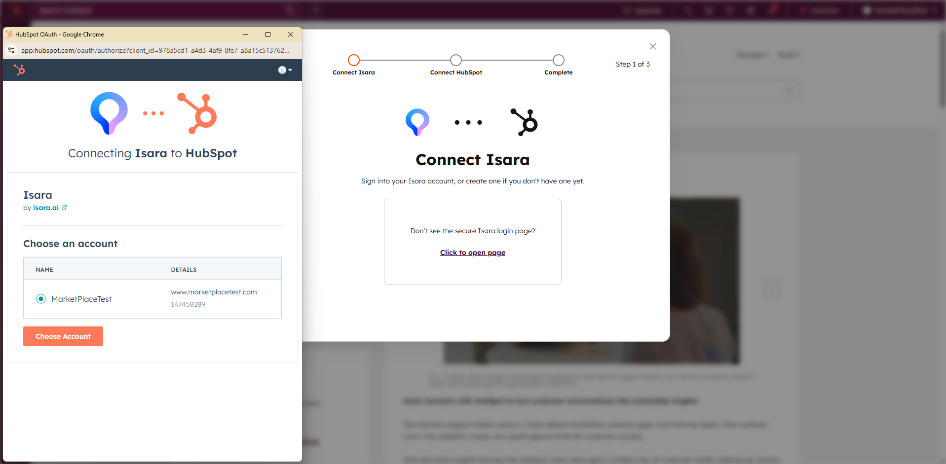 - Select your existing HubSpot account and click "Choose Account".